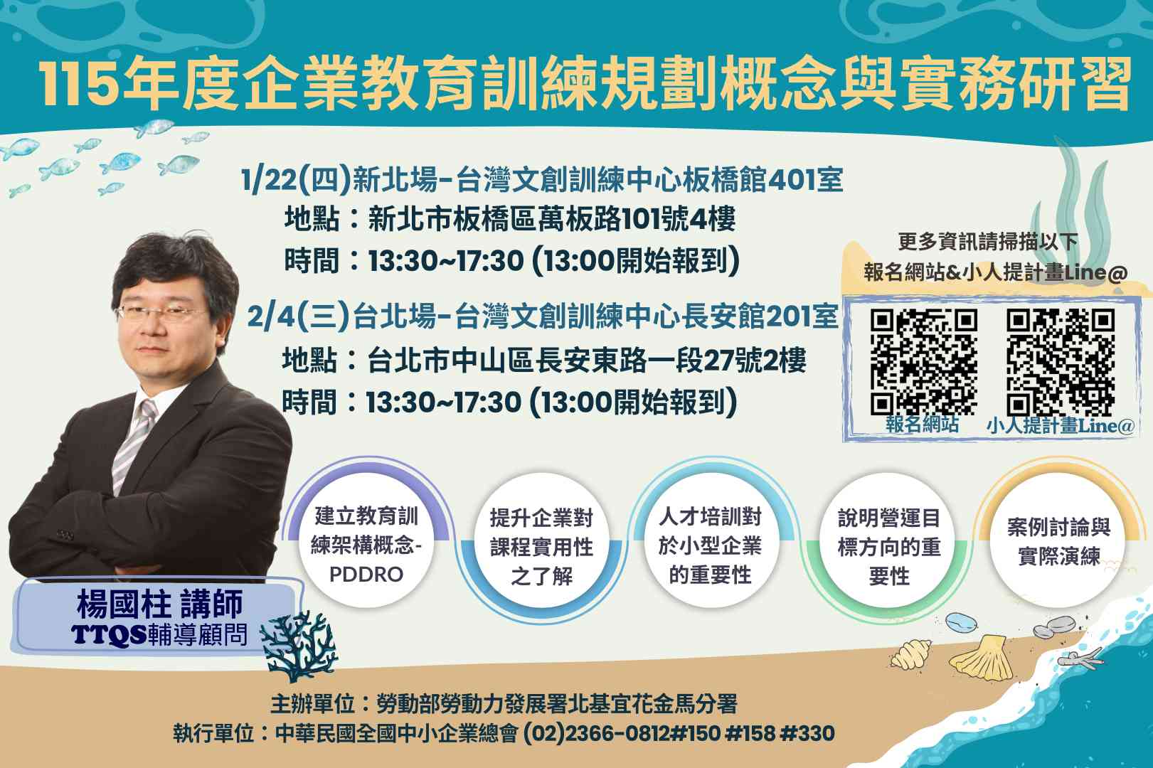 回到首頁 活動與課程 搜尋 共3筆 排序方式: 最新上架 ↑ 即將截止 ↑ 正在報名 ↑ 2026/01/20(二) ~ 2026/03/06(五) 115年度企業人力資源提升計畫暨充電起飛計畫-公開說明會及撰寫說明會 名額 870 已報名 已報名 0 2026/01/14(三) ~ 2026/03/04(三) 115年度小型企業人力提升計畫-公開說明會 名額 250 已報名 已報名 0 2026/01/05(一) ~ 2026/02/04(三) 115年度企業年度教育訓練規劃概念與實務研習 名額 130 已報名 已報名 0
