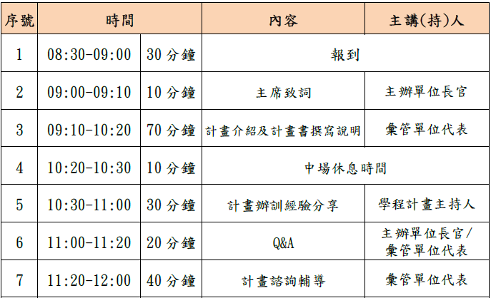 為使主辦單位所屬轄區內有意願申請本計畫之大專校院瞭解計畫實施重點及撰寫需注意事項等相關規定,規劃辦理115學年度「計畫提案申請說明會」,俾利順利完成提案申請作業。